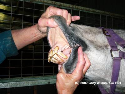 What was discovered when the horse was sedated, was some extremely long lower back teeth, which had grown so long the points were buried in the soft tissue of the upper jaw, which explains why the horse ate little and very gingerly. It also explained the overbite that had developed on the molars and was showing on the incisors.